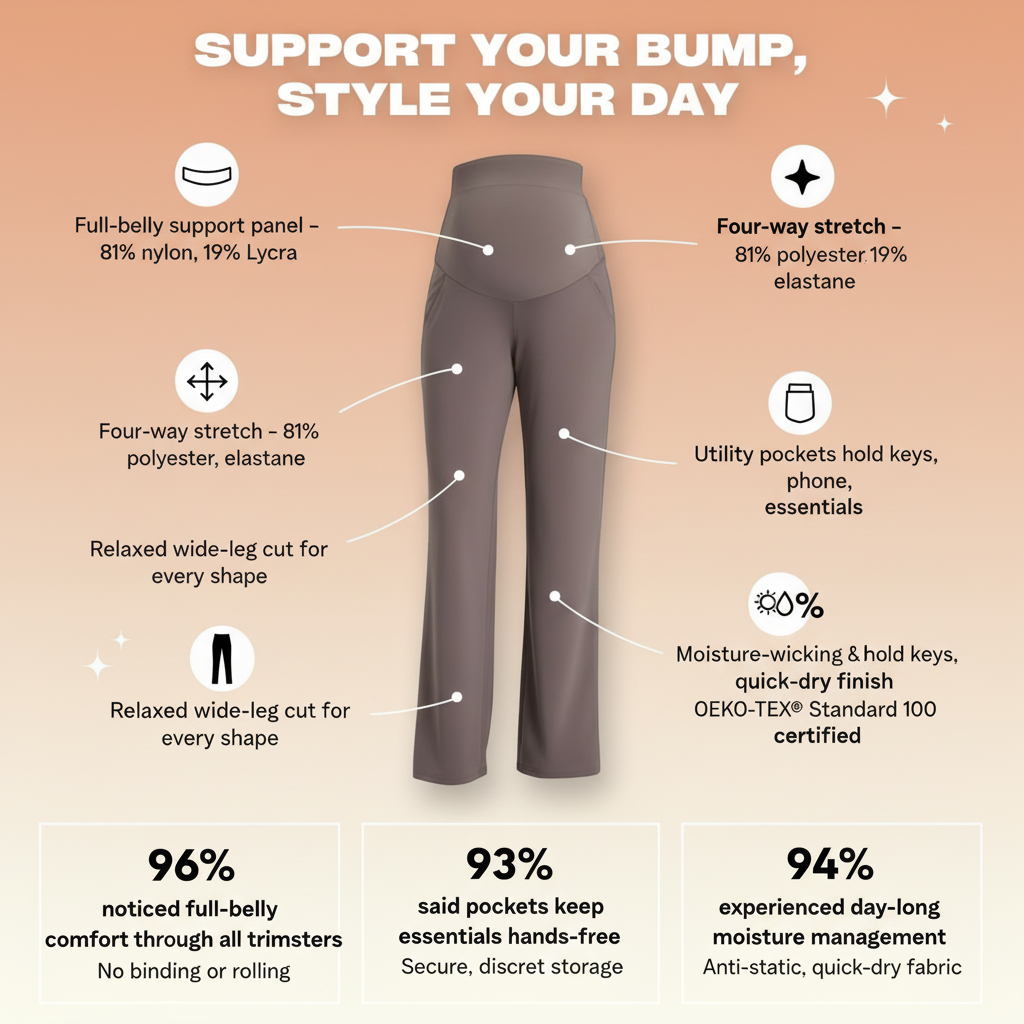 • Full-coverage bump panel that never rolls • Four-way stretch fabric for ultimate freedom • Elegant wide-leg cut for flattering style • Handy utility pockets for your essentials