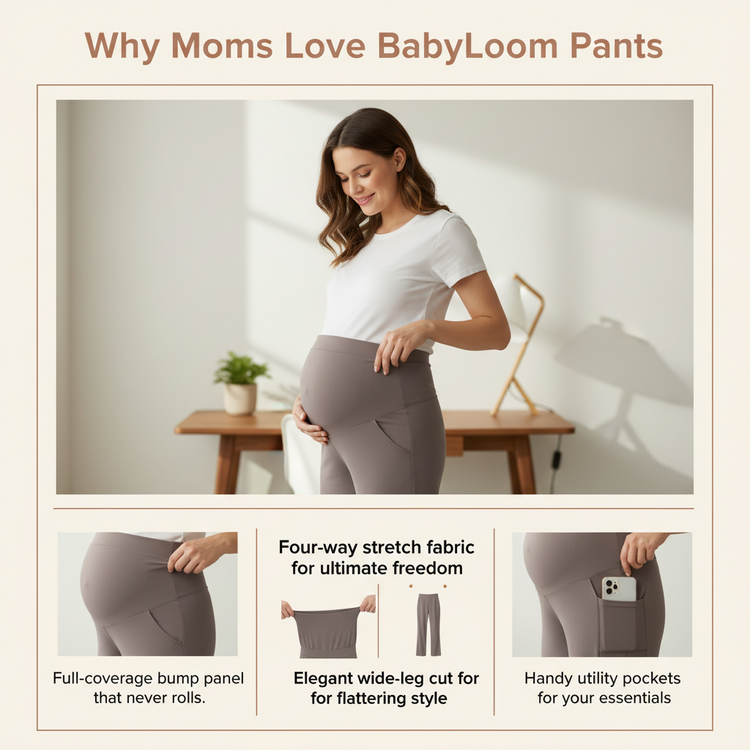 Experience the perfect blend of style, support, and safety with BabyLoom Wide Leg Pants. Your wardrobe—and your bump—will thank you.